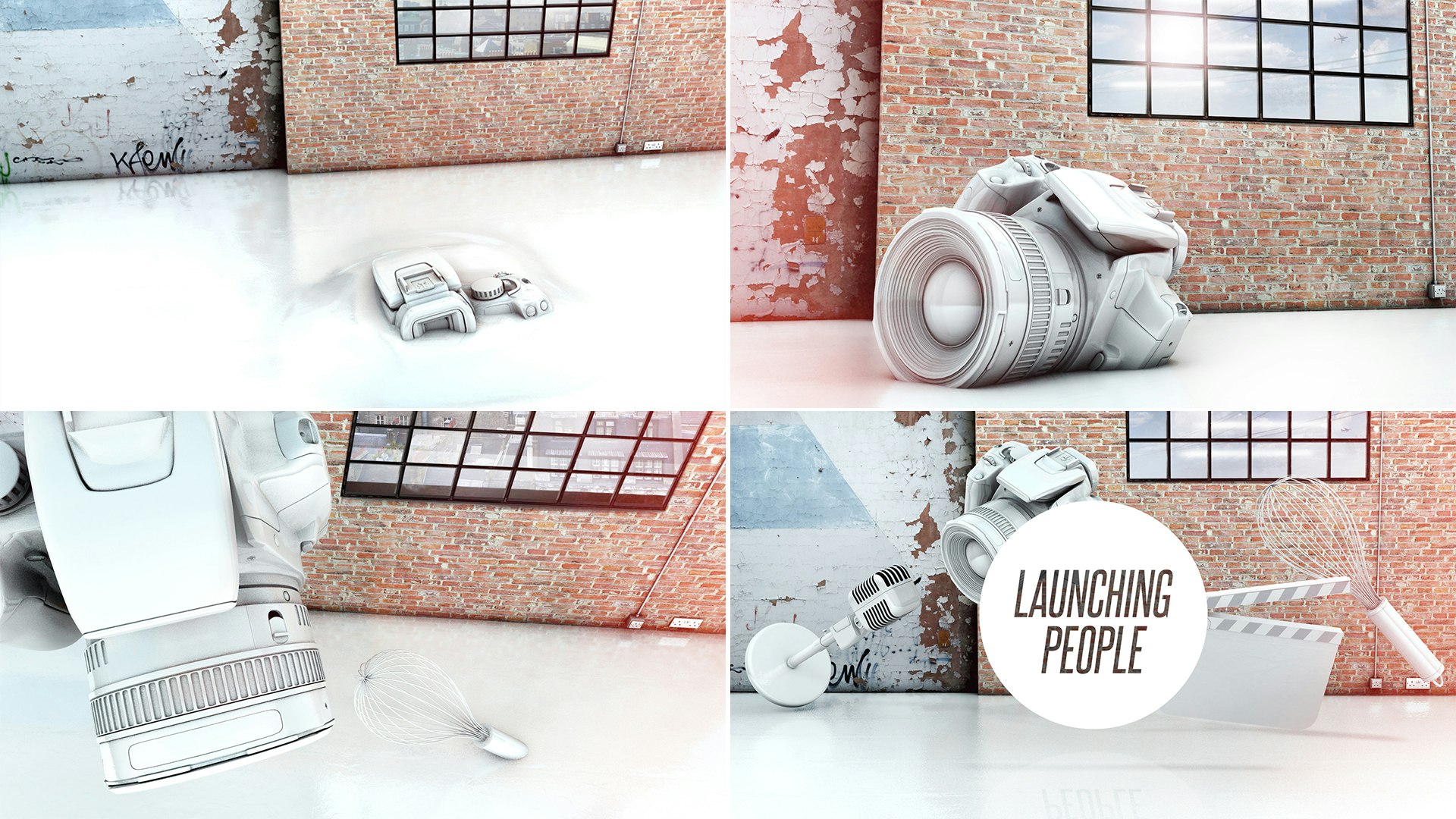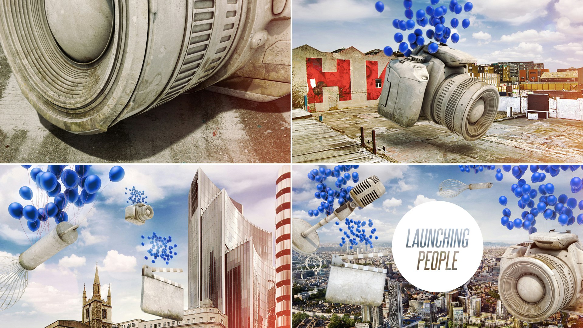 In this dramatic, visually arresting sequence we discover huge icons, cast in concrete, each representing one of the disciplines that feature in the programme, in a real environment. We start on a giant Digital SLR - defying expectation it begins to move across the ground before serenely lifting off. We cut wide to see it impossibly rising up skywards being lifted by helium filled balloons. We cut around different environments catching glimpses of the other icons before seeing them gather in the sky to conclude the sequence.