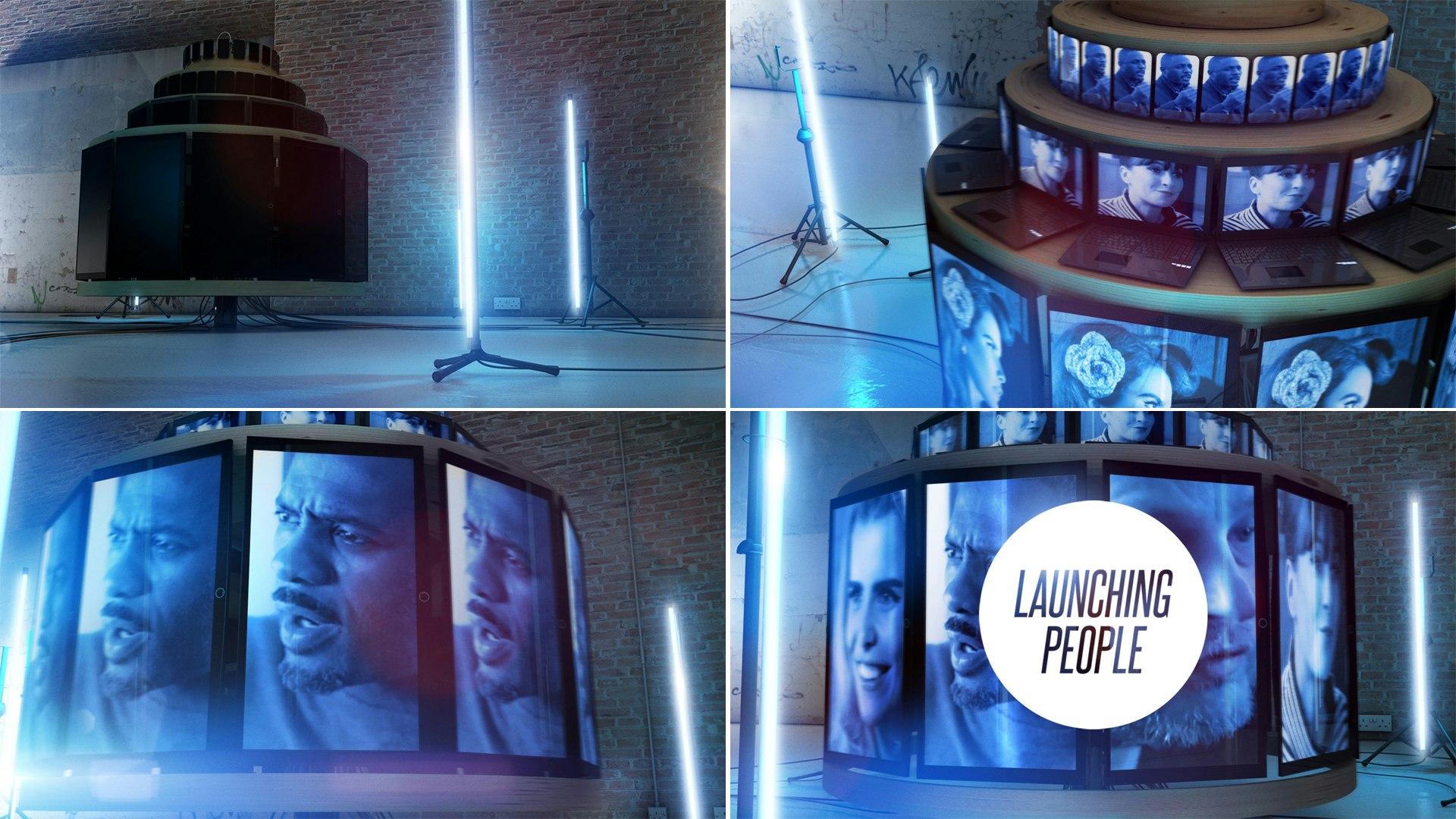 In an industrial exhibition space we discover a large-scale installation that consists of device screens arranged in columns. Initially static, anticipation builds as we hear the mysterious object powering up. The screens light up in turn, each column displaying still images of the mentors. As this happens the columns begin to freely rotate independently. The images become a blur until the machine reaches optimum rotation speed, when it reveals a smooth moving image. We cut around the scene picking up various moments of moving image on the screens. We conclude the sequence by pulling wide as the zoetrope continues to spin.